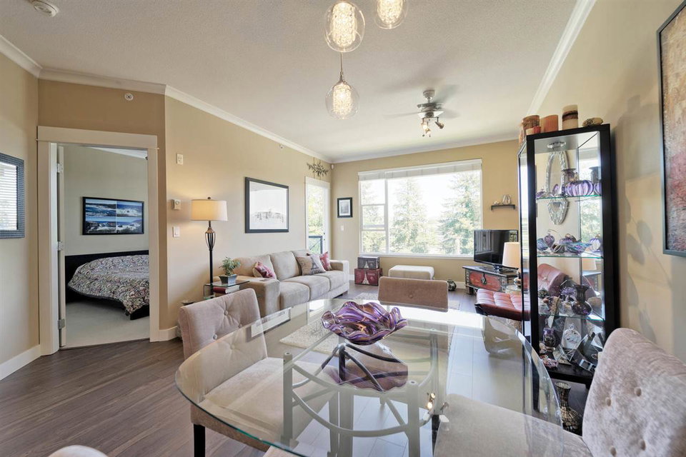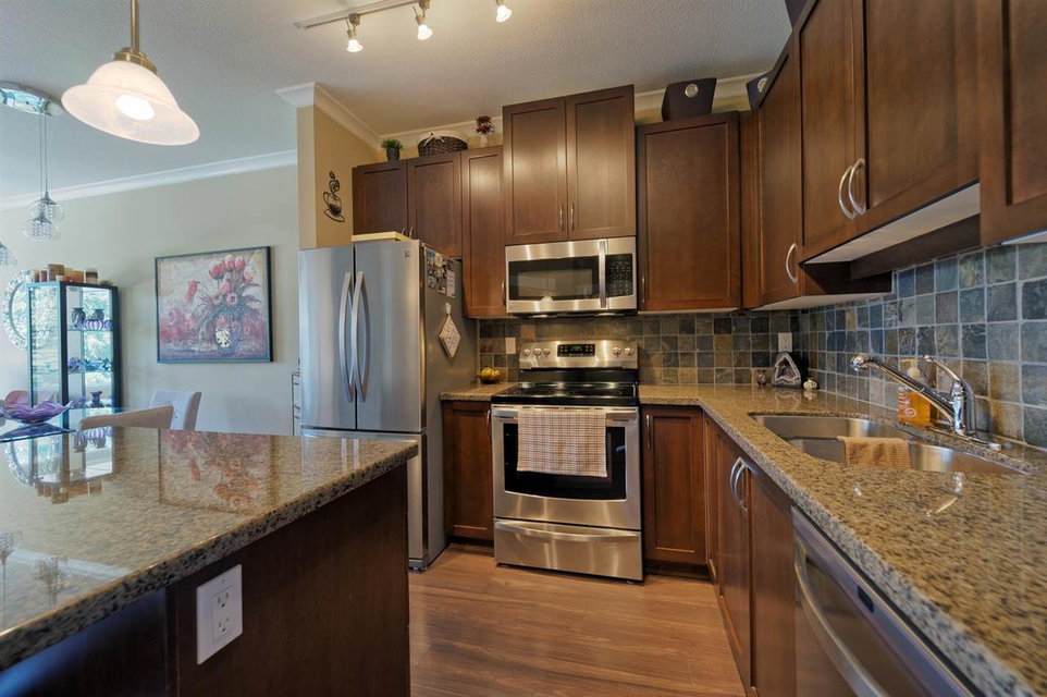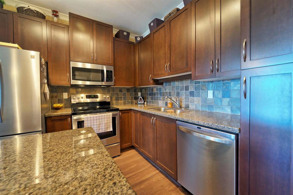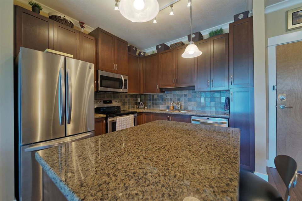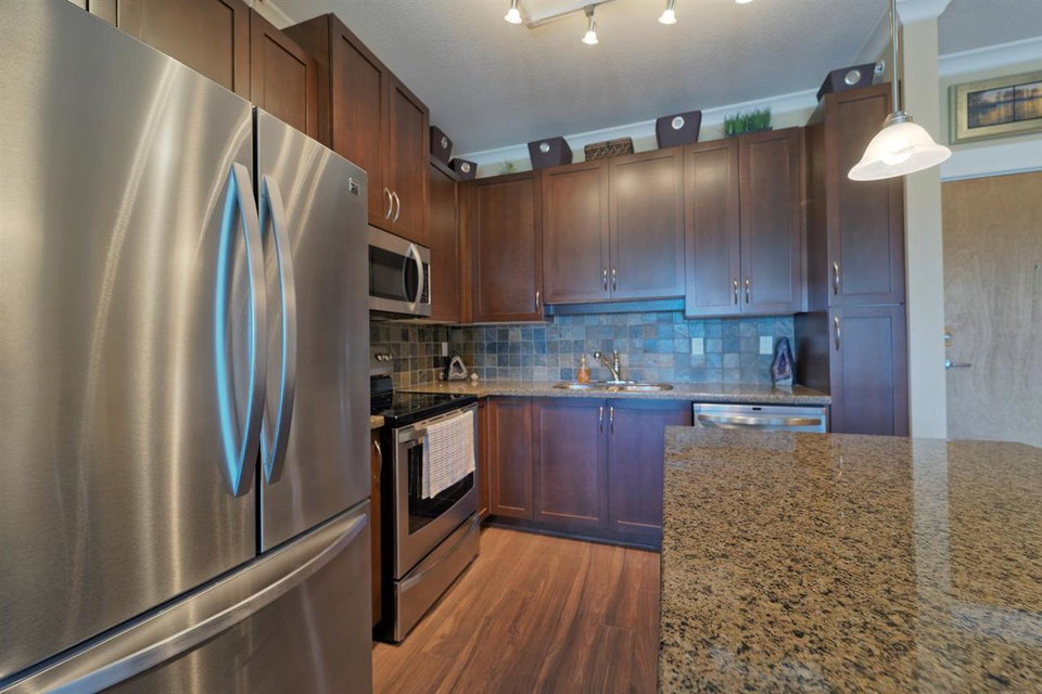 SPECTACULAR Top Floor Unit at the WESTWOOD!! Talk about upgrades!! 9’ ceilings, crown molding, FULL granite counter tops, NEW fridge, NEW range, NEW microwave, NEW dining/bathroom lighting, NEW laminate flooring, upgraded locks on both entry doors, ceiling fans added in living/bedroom, custom bike rack in parking stall and amazing mountain views from balcony! Very centrally located near shops, transit and parks. No rentals allowed. IMMACULATE condition and many more features! This unit comes complete with one parking stall.